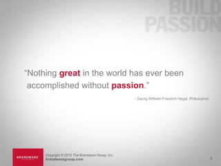 Brandware Public Relations is a top 100 independent PR agency founded in 2000. It has offices in Atlanta, New York, and Los Angeles. The agency specializes in automotive, powersports, consumer electronics, health tech, luxury lifestyle and enthusiast brands. It uses a 5-step approach of assessing, igniting, building, compelling and turning measurement into momentum. Recent case studies highlighted mitigating business threats, launching startups, building online destinations, national awareness campaigns, and connecting with new audiences.