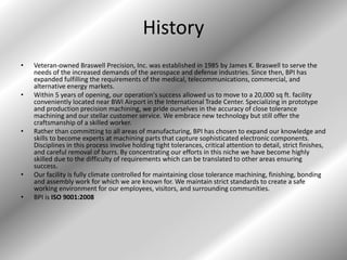 Braswell Precision Inc. has been a leading supplier of precision machined components for over 25 years. They attribute their success to service excellence and quality manufacturing. Their dedicated team delivers high quality parts on time through a strong management system that ensures customer requirements are met. They have extensive machining capabilities and quality control equipment for precision manufacturing.