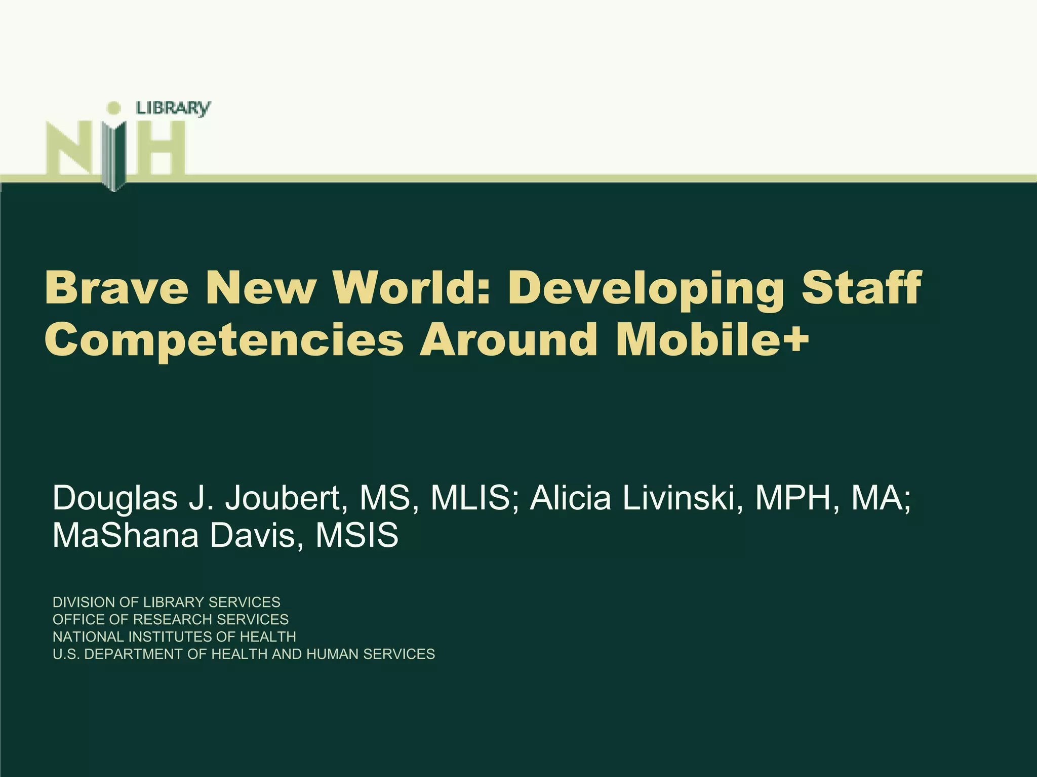 The document discusses the planning and implementation of a project at the NIH Library to develop staff competencies around mobile technologies. A team was formed to identify available mobile devices, authentication issues, and training priorities. Staff were surveyed about their mobile experience and preferences. Devices were deployed along with brown bag sessions, show and tells, and a multi-module training challenge for support staff. Evaluation was challenging due to staff reluctance and difficulty establishing outcome measures. Lessons learned included ensuring leadership support, dedicated team members, clear goals, and making training relevant for encouraging ongoing engagement.