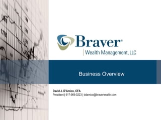This document provides an overview of Braver Wealth Management, an SEC registered investment advisory firm founded in 1987. It manages $550 million in assets using quantitative investment strategies focused on downside protection, risk control, and wealth preservation. Key aspects of its investment philosophy include acting to harvest gains while avoiding major declines, and utilizing cash as a true investment during periods of market weakness.
