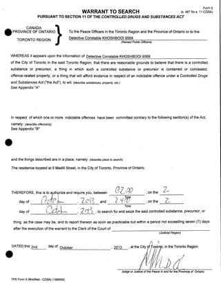 The document provides information to obtain search warrants for multiple locations related to a drug investigation. It describes offenses of possession and trafficking of marijuana allegedly committed by Alexander LISI on October 1, 2013. The affidavit requests search warrants for a vehicle, residence, commercial unit, detached garage, and second residence, believing evidence of the offenses will be found. The items sought include marijuana, drug paraphernalia, records, electronics, and surveillance equipment.