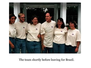 This document summarizes the author's experiences from a two month trip to Brazil in 1997 as part of a mission internship program. The author studied Portuguese, practiced their language skills daily, and took day trips around cities. They decided to devote their life to missions in Brazil after this experience. Though their career path changed, the author has no regrets about Brazil's role in shaping their life and thinks international experiences can greatly benefit young people.