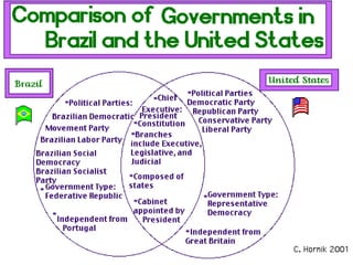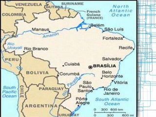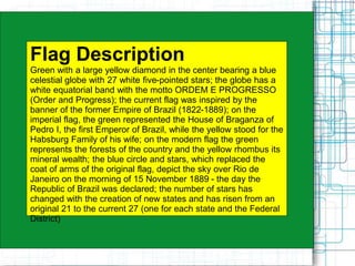The flag of Brazil consists of green with a yellow diamond in the center bearing a blue globe and 27 white stars. The globe represents the sky over Rio de Janeiro on the day the republic was declared. The number of stars corresponds to Brazil's 26 states and the federal district. Brazil gained a large territory through treaties with Spain and Portugal in the 15th century and the Iberian Union of 1580-1640. The country transitioned from a Portuguese colony to an independent empire in 1822 and a republic in 1889 without civil war, due to the influence of Emperor Pedro II. Brazil has a federal presidential representative democratic republic government with 26 states and a federal district.