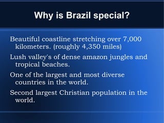 Brazil is the largest country in South America with over 7,000 km of coastline and diverse landscapes ranging from dense Amazon jungles to tropical beaches. It has a population of over 190 million people, mostly Portuguese speakers, and was formerly a colony of Portugal. Brazil has a complex system of rivers, including the second longest river in the world, the Amazon, and varies climates from equatorial to subtropical.