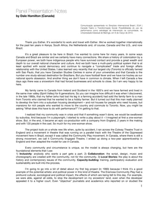 This document summarizes notes from a panel presentation by Dale Hamilton about their work using community-engaged theatre. Some key points: