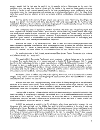 - Their first major project in 1990, the Eramosa Community Play, had profound cultural, social, and political impacts including stopping a housing development and influencing local elections.