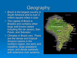 Brazil is the largest country in South America, spanning over 3 million square miles. The capital is Brasilia, and other major cities include Rio de Janeiro, Sao Paulo, and Salvador. Brazil has a diverse climate, from dense tropical rainforests in the north to grasslands and wetlands in other regions. Approximately 190 million people inhabit Brazil, mostly in the southeast and northeast. The population is highly diverse with descendants from indigenous peoples, Portuguese, Italian, and African slaves. Football is hugely popular and Brazil has won the World Cup a record 5 times.