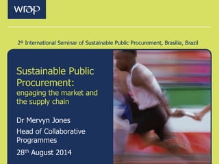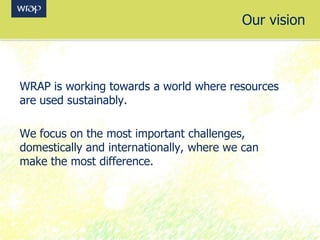 The document discusses sustainable public procurement and engaging suppliers and supply chains. It outlines WRAP's vision of sustainable resource use and focus on making the most difference domestically and internationally. Sustainable procurement can provide cost savings, increase supply chain resilience, support supply chain development of resource efficiency models, and meet multiple corporate social responsibility goals. An effective procurement process engages with suppliers, assesses needs, sets requirements, measures impacts, and reports on outcomes to influence the market toward more sustainable solutions.