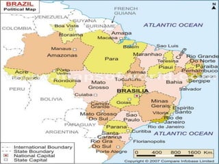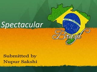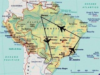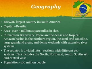 Brazil is the largest country in South America with diverse climates and ecosystems across its five regions. Some of Brazil's most notable landmarks include Christ the Redeemer statue and Sugarloaf Mountain in Rio de Janeiro, the Amazon rainforest and city of Manaus, historic Salvador, and the spectacular Iguazu Falls bordering Argentina. The proposed itinerary spends two days in São Paulo and Rio de Janeiro, with additional time in Salvador, Manaus, and Iguazu Falls, featuring city tours and excursions to many of Brazil's top geographic and cultural attractions.