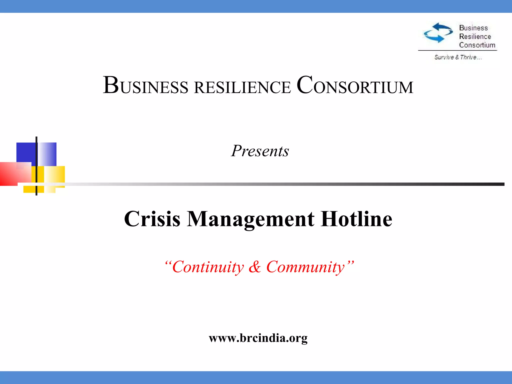 The document presents a Crisis Management Hotline (CMH) initiative by the Business Resilience Consortium to help organizations collectively manage crises. The CMH will provide a communication channel for business continuity managers to analyze, coordinate and collaborate on decisions during crises. Key benefits include wider visibility of crisis situations, faster response through collective decision making, and knowledge sharing. The CMH will have a coordinator, group members from different organizations, and a dedicated dial-in number. It will be activated for potential crises, support requests, or widespread situations and help reach consensus on actions through moderated calls. Ensuring the right coordinator and experienced continuity managers participate are factors for the CMH's success. The initiative aims to expand its reach
