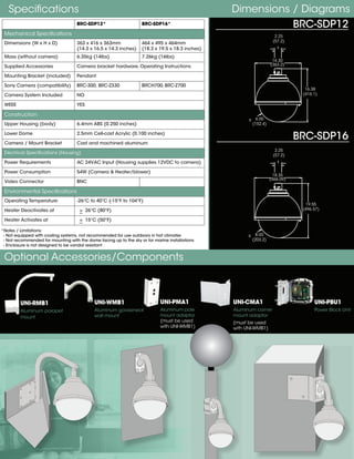The document describes the BRC-SDP series of domes which provide outdoor/indoor protection for Sony camera systems. The BRC-SDP12 supports the Sony BRC-300 camera, while the BRC-SDP16 supports the BRC-H700 and BRC-Z700 cameras. The domes include a heater, blower, UV resistant upper dome, and optically clear lower dome for environmental protection. Key features include pendant mounting, simple camera installation, security fasteners, 24-hour fan operation, and a thermostatically controlled heater.