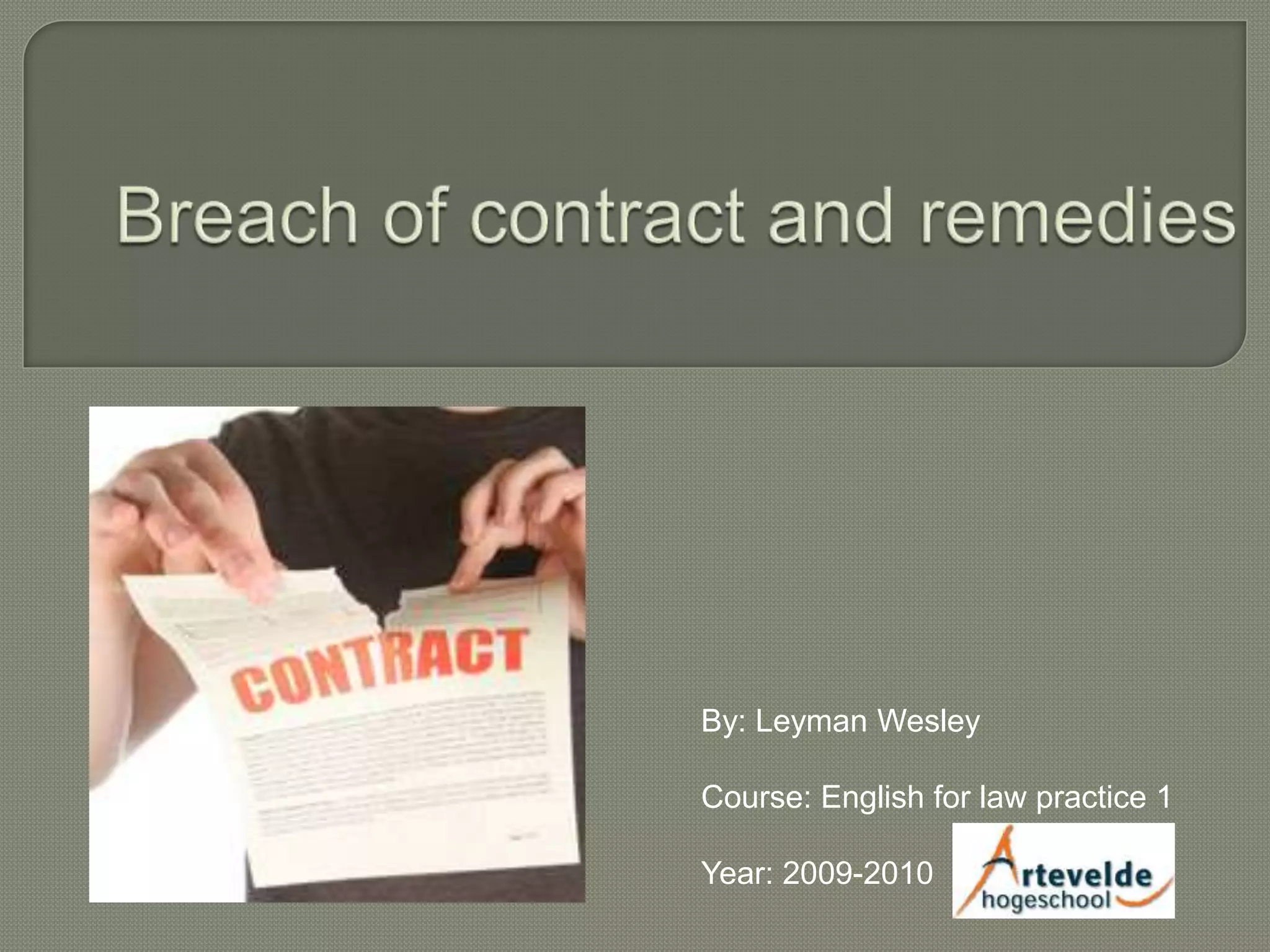 This document summarizes different types of remedies available for breach of contract, including stipulated damages, reliance damages, expectation damages, restitution damages, and actual damages. It notes that parties should foresee potential damages in the contract to allow for enforcement in court. While punitive damages may be available in some cases, their use depends on laws and whether compensation and costs are sufficient. The document recommends always foreseeing damages and using arbitration for faster dispute resolution to prevent harms from contract breaches.