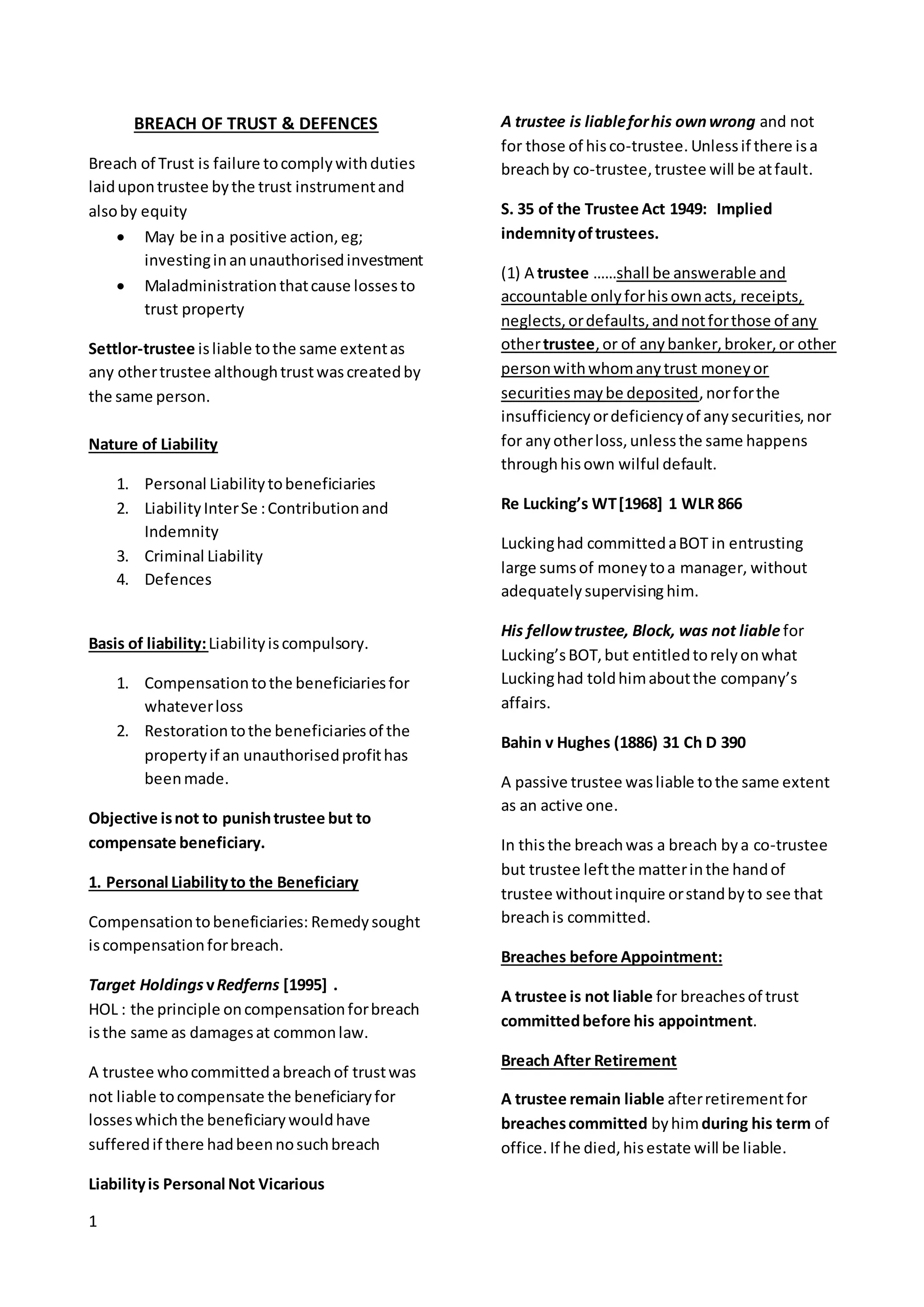 This document discusses breach of trust and defenses for trustees. It defines breach of trust as failing to comply with duties outlined in the trust instrument or by equity. Trustees can be personally liable to beneficiaries for losses caused by their breaches. However, trustees have several defenses that may allow them to avoid personal liability, including: consent of beneficiaries, approval of beneficiaries after the breach, expiration of the limitation period, statutory relief if the trustee acted honestly and reasonably, advice of a solicitor, breach by a single trustee alone, and exemption clauses in the trust document. The document analyzes these defenses in detail using case examples.