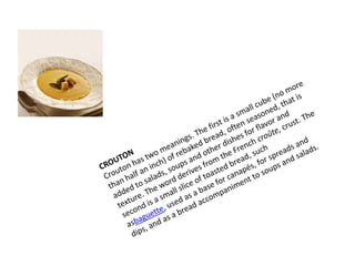 This document provides information on various types of bread from around the world in short descriptions. It discusses calzone, an Italian bread often served with marinara sauce; chapati, a staple flatbread from Pakistan and India made from wheat flour and cooked on a grill; Cuban bread, a white bread similar to a baguette but made with lard or shortening; and croissant, a rich, buttery roll made of puff pastry layered with butter. It also mentions crispbread, an ancient Scandinavian bread; cornbread, an American bread made from cornmeal; colomba di Pasqua, an Italian Easter bread shaped like a dove; and ciabatta, an Italian wheat loaf with a