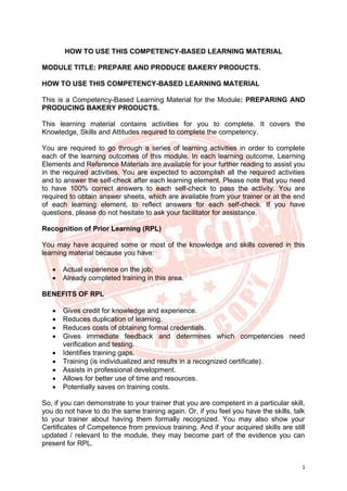 The document provides information on preparing bakery products. It defines different categories of bakery goods and outlines the skills needed to produce doughs in good condition, including calculating dough yield and water temperature requirements. It also describes selecting ingredients according to establishment type and recipes, and preparing a variety of bakery products by measuring and weighing ingredients accurately.