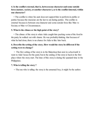 The story follows a young boy who dreams of becoming a professional violinist and being with his love, Aida. However, he begins to realize that not all dreams can come true as he faces challenges from his aunt and the realities of life. By the end of the story, the boy has changed from his fantasies and woken up to the fact that he is not yet ready for the real world, symbolized by the bread not being ready. The external conflict involves the boy's aunt not supporting his musical ambitions due to societal expectations of musicians. The climax occurs when Aida catches the boy taking food from a party due to his aunt's views, damaging his hopes of her affection.