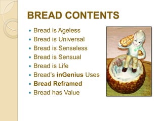 This document discusses the value and uses of bread. It notes that bread was first made 30,000 years ago and remains relatively unchanged, acting as a symbol of food, money, and health throughout history. While bread is senseless on its own, it affects all five senses when consumed. The document then lists several unexpected uses for bread beyond eating, such as for erasing scorched rice or absorbing odors. It argues that bread's true value lies not just in its monetary cost but also in the jobs and livelihoods it provides through bakeries, and as an affordable way for families to feed themselves.