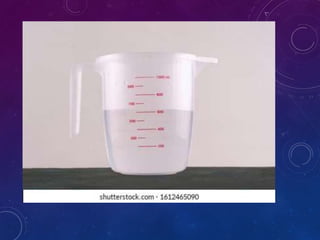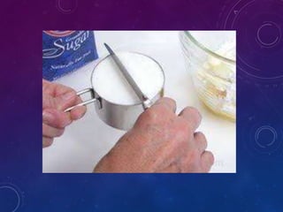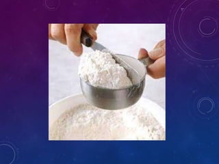 The document provides information on techniques for accurately measuring and weighing ingredients used in baking. It discusses proper methods for measuring both dry ingredients like flour, sugar, and leavening agents as well as wet ingredients like oil, butter, eggs and liquids. The importance of accurate measurement is emphasized for producing standard, high quality baked goods and efficiently using materials. Various ingredients commonly used in baking are also defined, including their properties and functions.