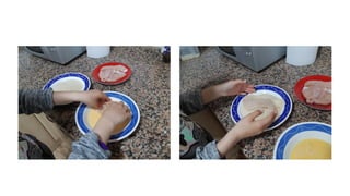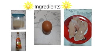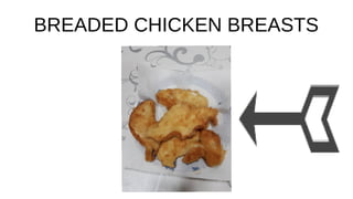 This document provides instructions for making breaded chicken breasts. It lists ingredients and utensils needed and provides directions which include coating chicken fillets in beaten egg and breadcrumbs before frying them in oil until browned. The coated chicken breasts are then placed on a paper towel-lined plate to absorb excess oil before serving.