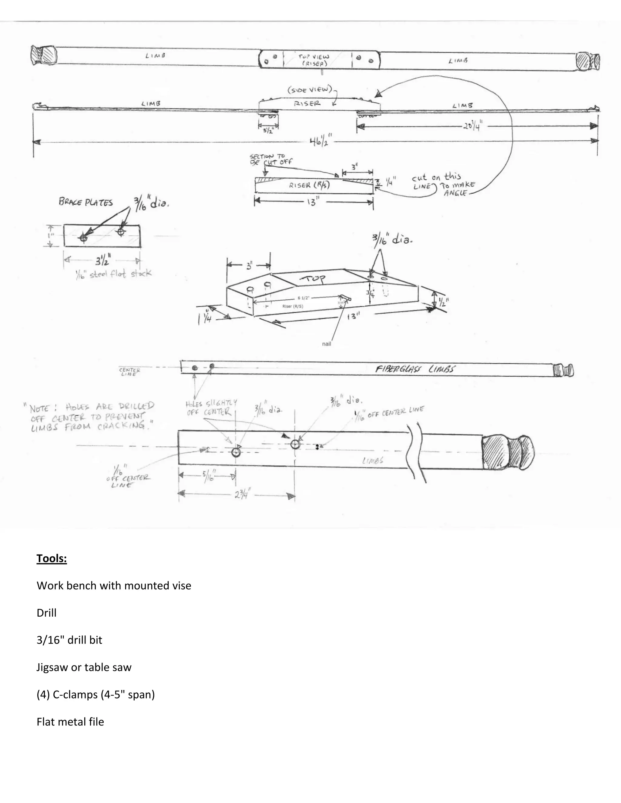This document provides instructions for making a takedown recurve bow. It lists the necessary tools and materials, which include a youth bow kit, wood, metal plates and screws. It then provides 18 steps to assemble the bow, including cutting the limbs to length, drilling holes to attach the limbs to the wooden riser grip, and adding metal plates and screws to connect the limbs securely while allowing them to be detached. The final steps include stringing the bow and making a carrying case.