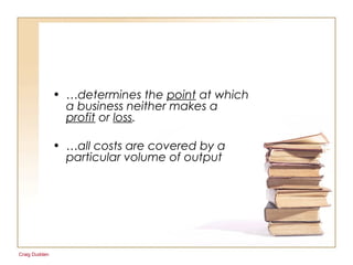 The document discusses break even analysis, which determines the level of output and sales required for a business to neither profit nor lose money. It provides an example calculating the break even point for an MP3 player business as 1,000 units. Break even analysis is useful for product launches and diversification to understand the sales needed to cover costs. Maintaining output above break even provides a margin of safety and results in profits.