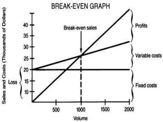 This document defines and explains break even analysis. It lists the group members and contents. Break even analysis determines the level of output needed for total revenue to equal total costs. It discusses calculating break even points using fixed and variable costs. The purpose is to provide a rough earnings indicator. Limitations include not accounting for demand changes. Calculators are available to assist with break even calculations.