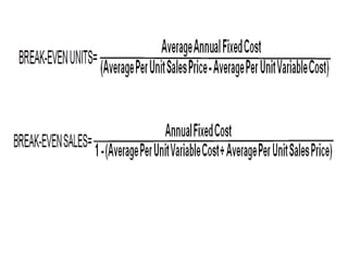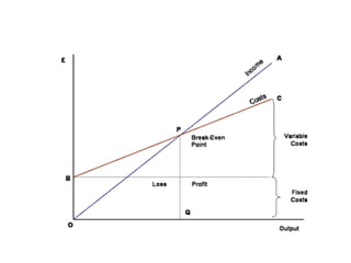 Fixed costs remain constant regardless of production levels, while variable costs change with production. The break-even point is where total revenue equals total costs, indicating no profit or loss. Break-even analysis determines the sales or production volume needed to cover total costs and calculates fixed and variable costs to evaluate new ventures and products, set goals, and understand the relationship between production and marketing.