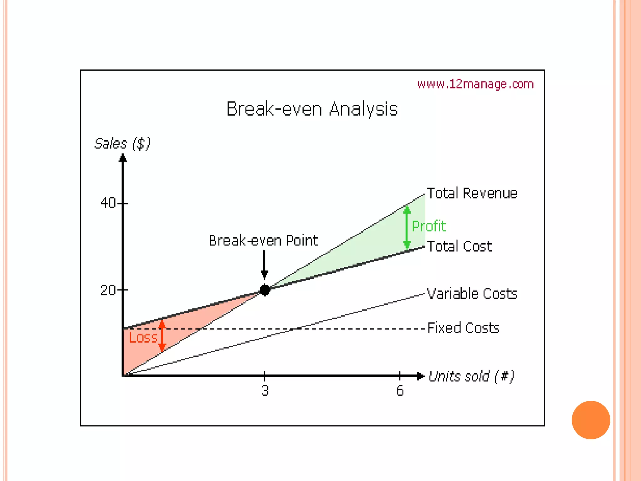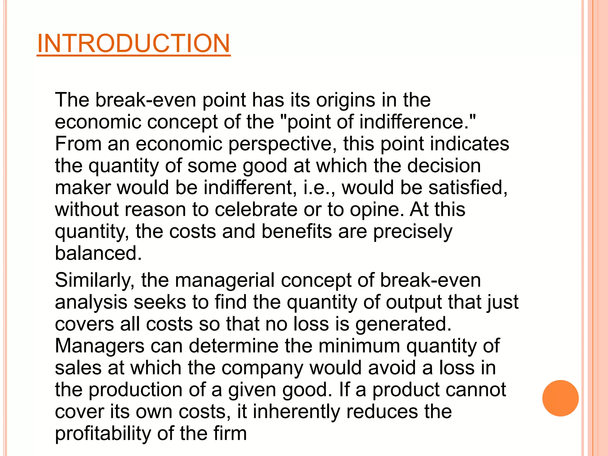 This document discusses break-even analysis, which is used to determine the sales volume needed for a company to cover its total costs. It defines break-even as the point where total revenue equals total costs, with no profit or loss. The formula for calculating break-even point is provided as fixed costs divided by contribution per unit. Examples are given of calculating break-even points based on variable costs, fixed costs, and unit price. Advantages and limitations of break-even analysis are also summarized.