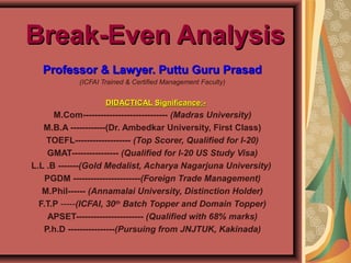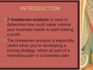 Break-even analysis is used to determine the sales volume needed for a business to start making a profit. It calculates the fixed costs and variable costs per unit and determines the break-even point - the number of units that must be sold to cover total costs. It can help with pricing strategy, examining profitability impacts, and deciding sales quantities. Limitations include assuming fixed costs are constant and not accounting for changes in inventory or multi-product businesses. Break-even analysis should be distinguished from flexible budgets and standard costs which are concerned with cost components and control rather than the relationship between costs, revenues and sales volumes.