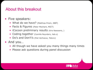 This document summarizes a presentation about collaboration tools available through IBBT. It includes five speakers who will discuss what tools are currently available, usage statistics, preliminary results from a project called iCocoon, tips for coding together, and best practices for collaboration. The presentation focuses on the extranet website MyBBT which provides tools like wikis, document libraries, calendars, discussion boards, and video/phone conferencing. While many tools are offered, some like collaborative writing and task management are not provided yet. The presentation aims to explain what is offered and get input on how IBBT can better support collaboration.