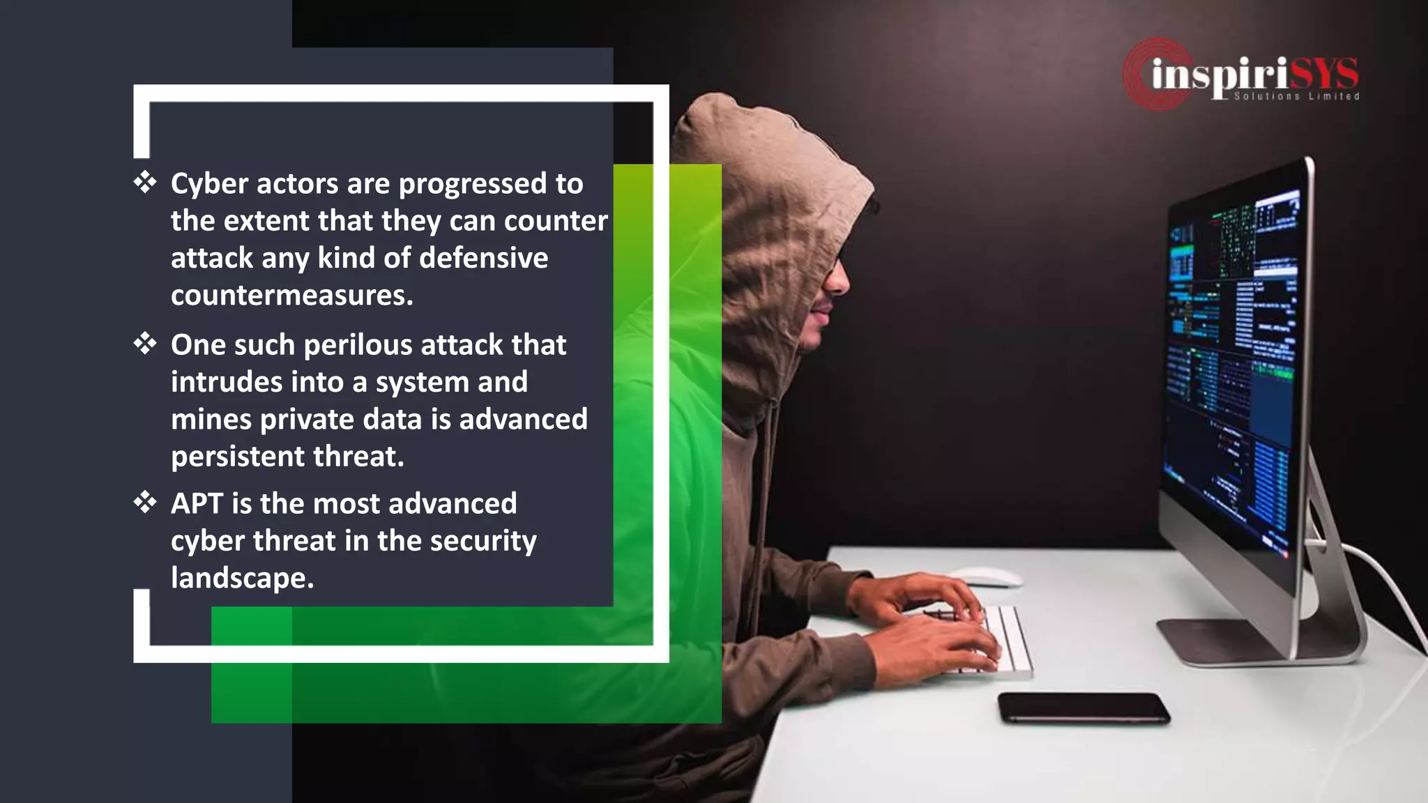 The document discusses advanced persistent threats (APTs), highlighting how cyber actors can counter defensive measures and detailing a seven-phase attack process that includes reconnaissance, payload delivery, and data exfiltration. It emphasizes the sophistication of APTs in infiltrating systems and suggests that organizations must adopt a multi-layered defense strategy, which includes firewalls, antivirus, intrusion prevention systems, and advanced email protection, to mitigate these threats. Inspirisys offers solutions to help organizations defend against APTs effectively.