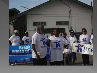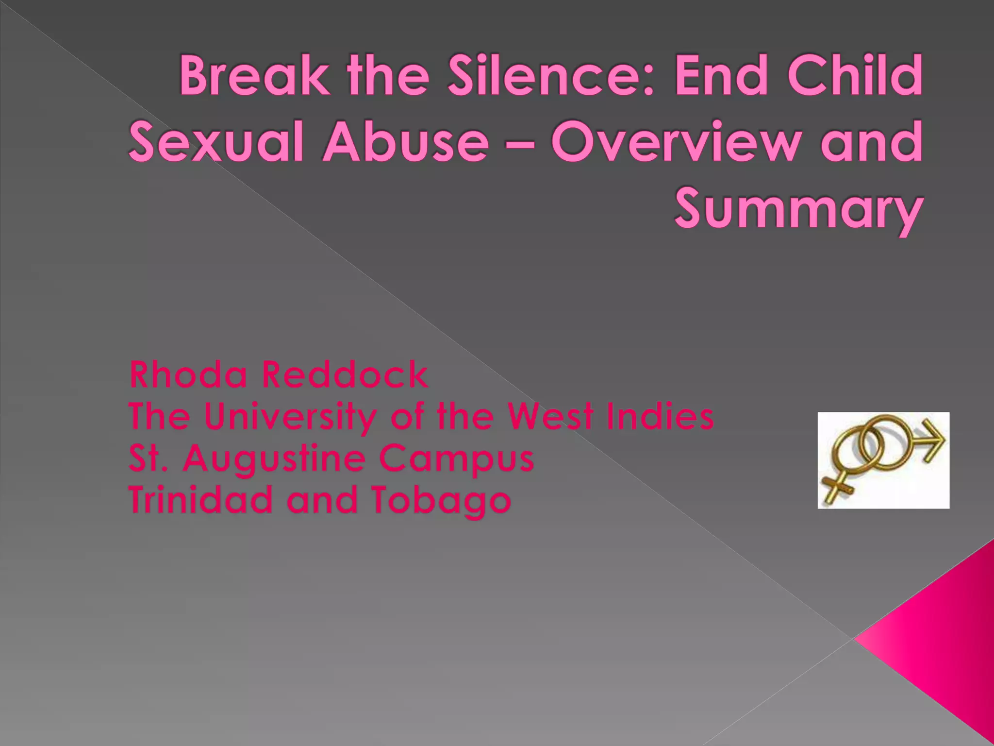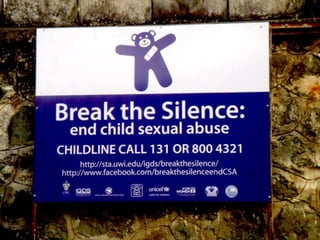 The document outlines a research project focused on understanding and addressing child sexual abuse (CSA) and childhood incest in Trinidad and Tobago, highlighting its prevalence and the socio-cultural factors that contribute to it. The study, carried out between 2008 and 2011, aimed to develop community-based interventions and raise awareness through the Break the Silence (BTS) campaign, which emphasizes the need for new protocols, policies, and support systems. Findings indicate that CSA is rampant, often normalized within communities, and calls for comprehensive strategies to empower victims and address underlying issues of gender inequality and societal norms.