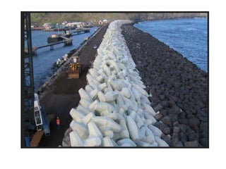 This document provides information on different types of breakwaters, including rubble mound, detached, attached, and solid or vertical breakwaters. It discusses parameters for breakwater construction such as geotechnical investigations, wave hindcasting, and cross-sectional design. Rubble mound breakwaters are made of quarried rock and armor stones and are suitable for shallower depths, while caisson breakwaters can be used in deeper waters. Proper design considers factors like foundation material, water depth, and wave height.