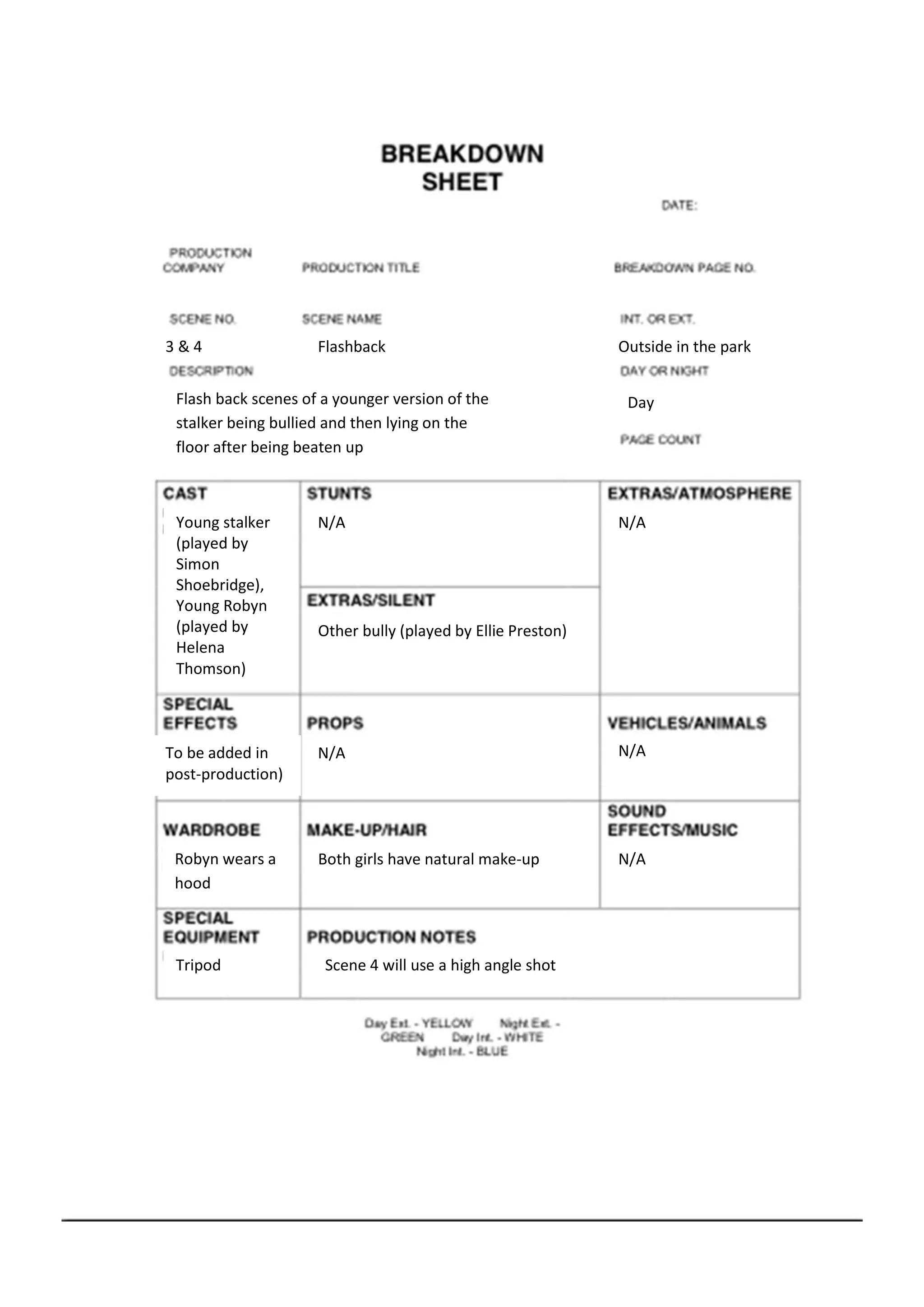 The document appears to be production notes describing scenes from a film or television show. It includes descriptions of flashback scenes showing a young stalker being bullied by other children in a park. One scene will feature a young version of the stalker played by Simon Shoebridge lying on the ground after being beaten up. Another scene includes the stalker and a young Robyn played by Helena Thomson being bullied by another child played by Ellie Preston.