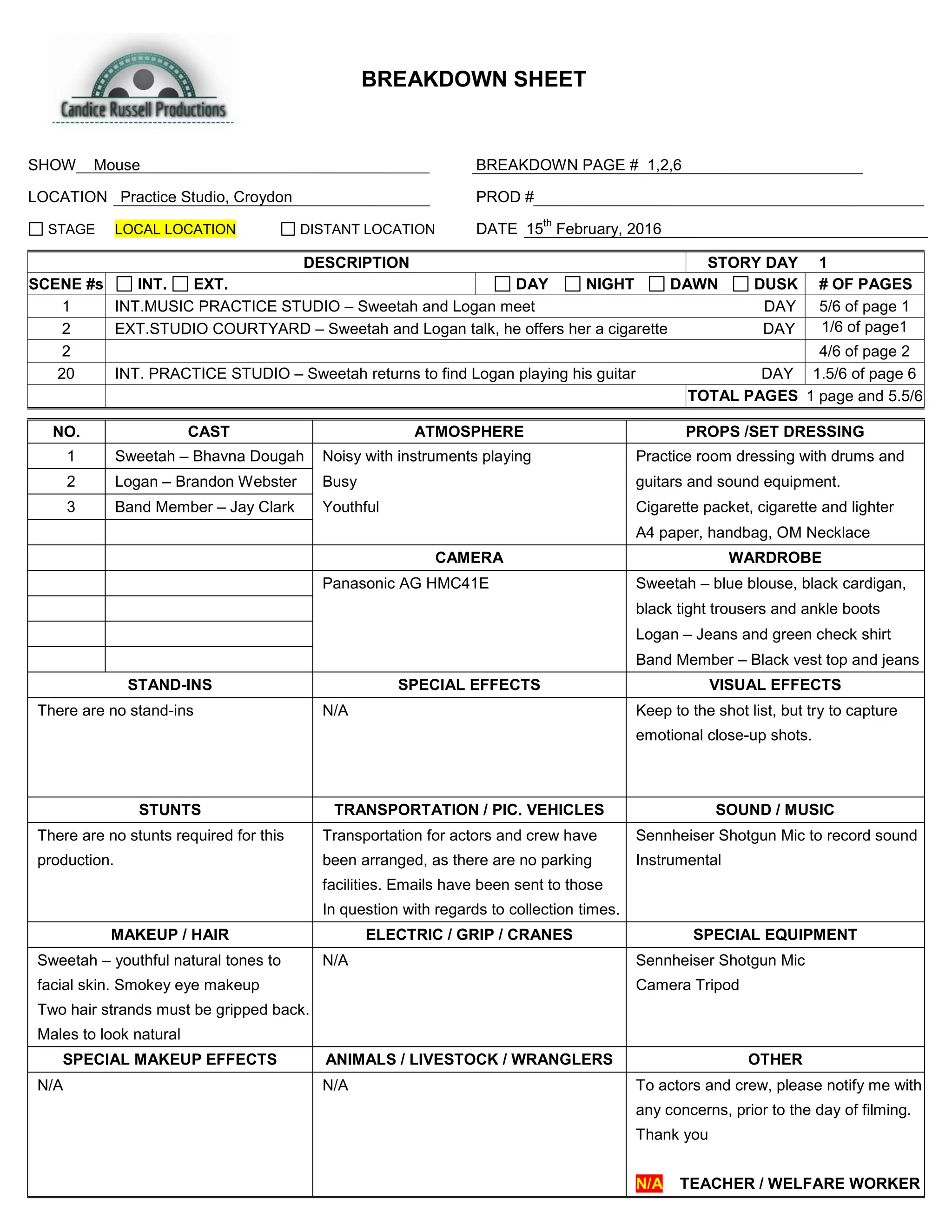 This document provides a breakdown and description for scenes in a short film involving Sweetah, Logan, and a car yard owner. It includes details on the scene locations, times of day, number of actors involved, required props, wardrobe, equipment, and transportation. The story takes place over one day and involves Sweetah and Logan meeting at a music studio, then breaking into an abandoned car yard where Logan offers Sweetah drugs and they have a tense encounter with the car yard owner.