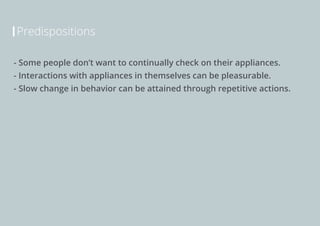 The document discusses how to enhance user interaction with household appliances by creating enjoyable 'breakdowns' that draw attention to energy-saving features. Primary research reveals that many users overlook complex controls and prefer simple, intuitive feedback from appliances. The conclusion emphasizes that minor adjustments can facilitate user engagement and promote eco-friendly behaviors without drastically altering existing workflows.