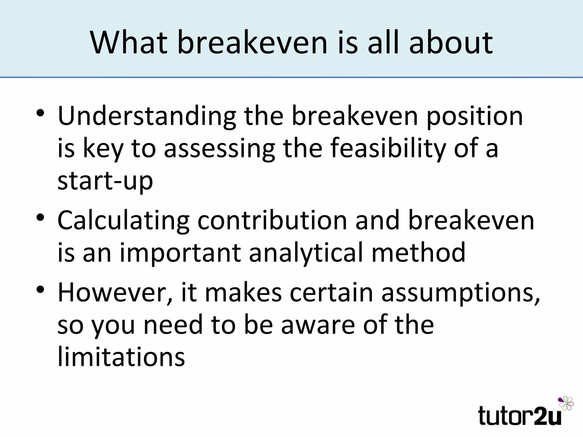 This document discusses breakeven analysis, which is used to calculate the level of output or sales needed to cover total costs. It provides three methods to calculate breakeven output: using a table, formula, or graph. The key assumptions of breakeven analysis are also outlined, as well as its strengths and limitations for business planning. Calculating contribution and breakeven output is an important analytical method, but businesses need to be aware of its assumptions and that it is not a proven method on its own.