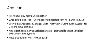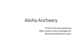 Alisha Ancheary has 9 years of experience in operations management at a chemical company. She holds a BTech in chemical engineering and an MBA in human resource management. The document discusses break-even analysis, which is used to determine the level of production or sales needed to cover total costs. It defines key terms like fixed costs, variable costs, and contribution margin. An example calculation shows how to determine the break-even point in units and sales revenue. Benefits of break-even analysis include setting revenue targets and making better pricing decisions. Limitations include not accounting for variable demand and assuming fixed costs remain constant.