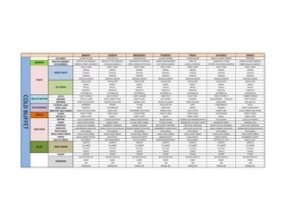 The document outlines the weekly menu for Monday through Sunday. It includes options for cold cuts, non-veg and veg sandwiches, whole and cut fruits, juices, smoothies, breakfast items like muffins and pastries, breads, vegetables, yogurt, spreads, and a cold buffet section. A variety of ingredients are listed each day for different food categories.
