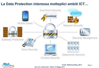 Il documento discute l'importanza della data protection e le diverse normative che la regolano, evidenziando come le aziende devono adattarsi a nuove tecnologie e attacchi informatici. Vengono analizzate le esigenze progettuali, tra cui la riservatezza, la continuità e la gestione delle minacce, nonché l'approccio al disaster recovery. Infine, il successo delle strategie di data protection è legato a fattori come la conformità normativa, la governance e l'adozione di tecnologie appropriate.
