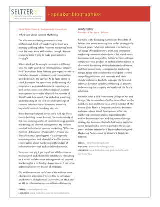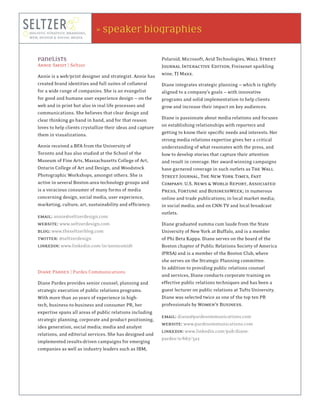 Seltzer Design provides strategic branding, design, and marketing services. They help clients craft compelling communications through identity development, print, web, and social media solutions. The panelists include Annie Smidt, a designer and strategist; Diane Pardes, who provides public relations counsel; and Erin Rodat-Savla, an independent consultant specializing in content marketing. The moderator is Rochelle Seltzer, president and creative director of Seltzer Design.