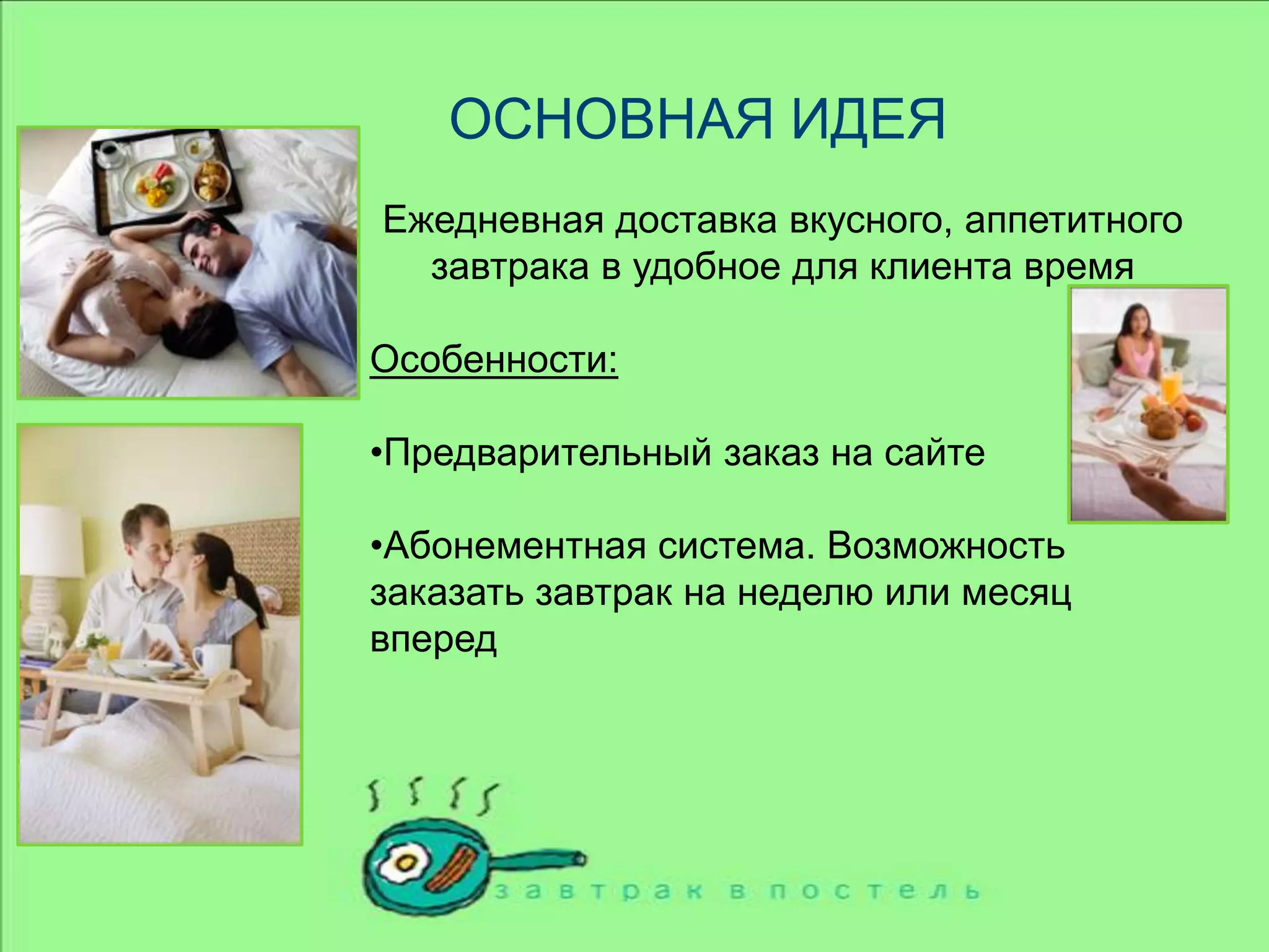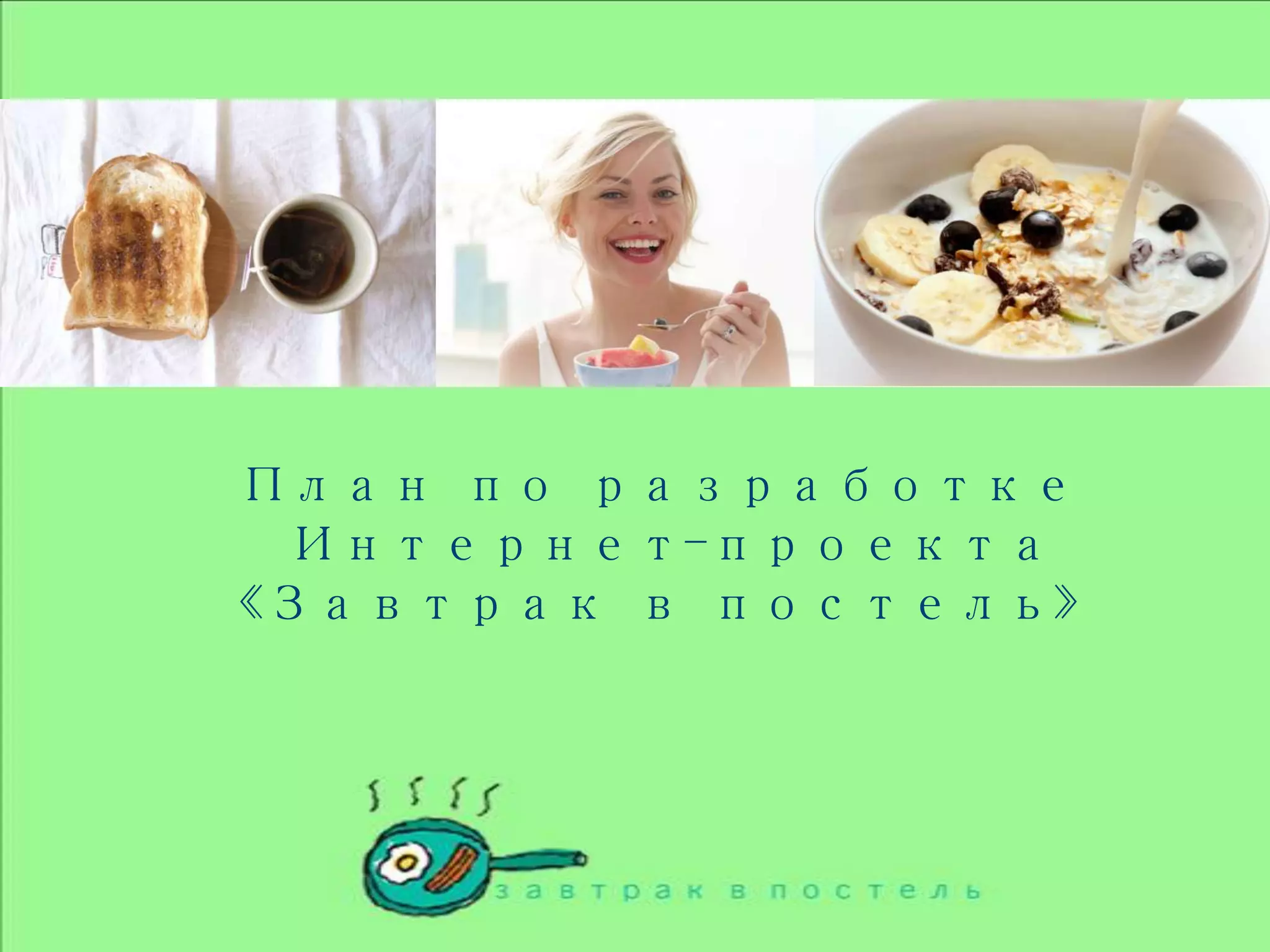 Документ описывает план интернет-проекта 'Завтрак в постель', который предполагает ежедневную доставку завтраков с возможностью предварительного заказа и абонементной системы. Основная целевая аудитория — обеспеченные люди с ограниченным временем на приготовление пищи, а рынок доставки завтраков в России в основном свободен. Проект требует создания трех ключевых отделов и начальный бюджет составляет около 1 миллиона рублей.
