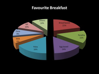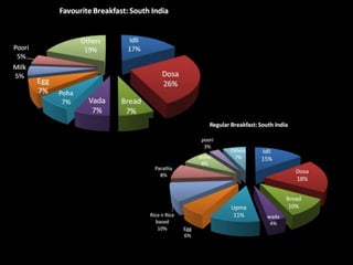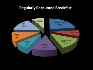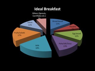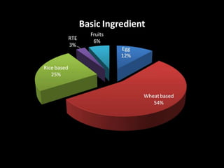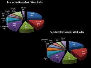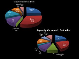 The document analyzes opportunities in the breakfast segment in India. It finds that nuclear families, working women, higher disposable incomes, and fast-paced lifestyles are driving needs for more convenient, healthy, and tasty breakfast solutions. Primary research shows that bread-based breakfasts are most common pan-India, while preferences vary regionally. The insights recommend developing a shelf-stable bread variety filled with regional fillings like paratha paste in North India or poha in West India to meet consumer demands for convenient, portable breakfasts spent 5-10 minutes.