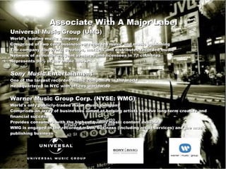 The document discusses the major record labels in the music industry, including Universal Music Group, Sony Music Entertainment, and Warner Music Group. It then provides information on the UK music charts and market trends in 2009, including the success of albums by Susan Boyle and singles by Lady Gaga. It also discusses strategies for independent artists, such as developing an online presence through an electronic press kit, holding live media events, and using windowing strategies to build demand for new music releases.