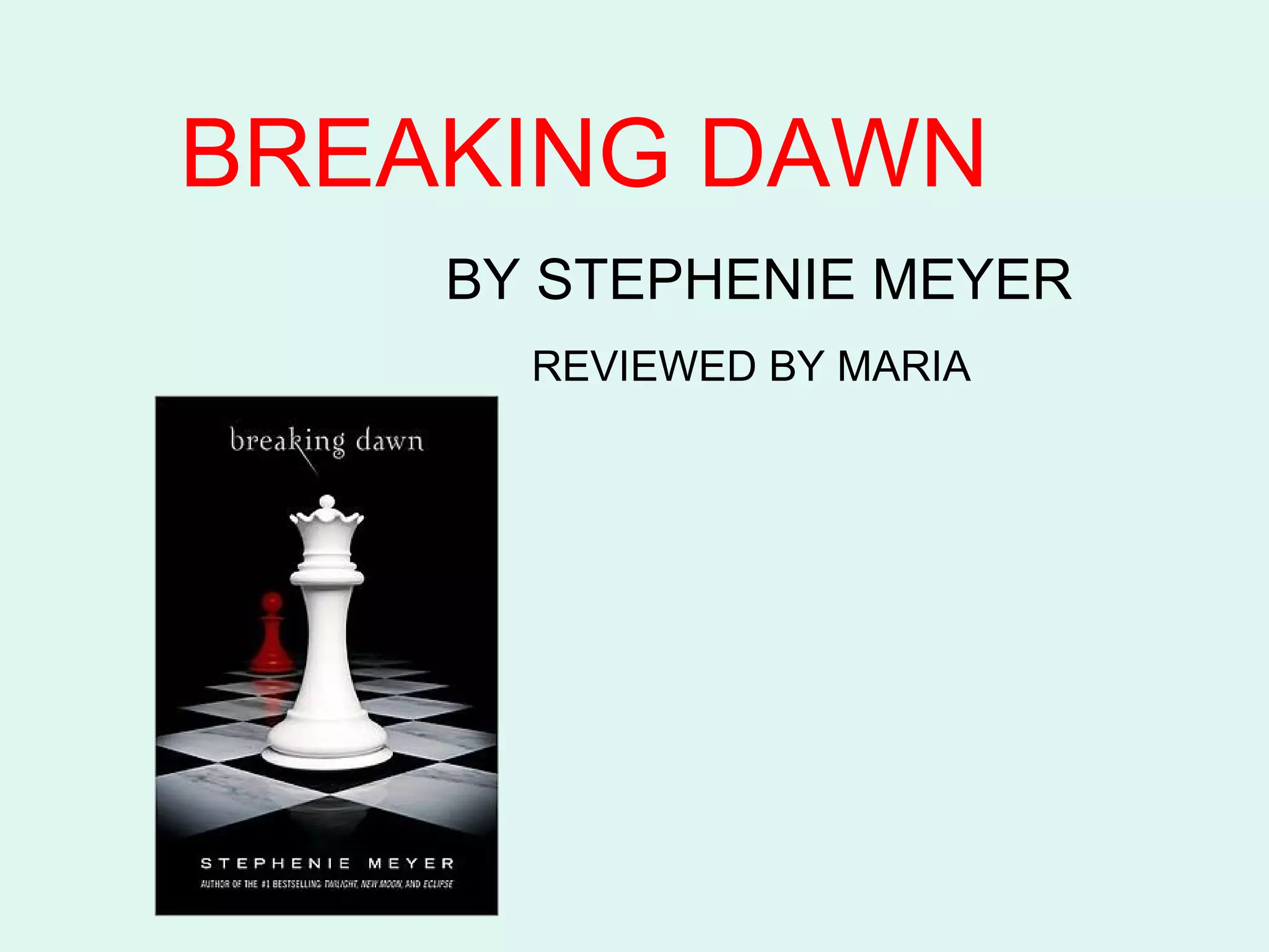 This document summarizes the plot of the fourth and final book in the Twilight saga, Breaking Dawn, by Stephenie Meyer. It discusses Bella and Edward's wedding and honeymoon, where Bella becomes pregnant with Edward's vampire-human child. The pregnancy threatens Bella's life and she must be turned into a vampire. Their daughter Renesmee is born but is targeted by the Volturi, who want to kill vampire children. Bella and Edward's family gather witnesses to prove Renesmee's maturity and save her, allowing the family to live happily together.