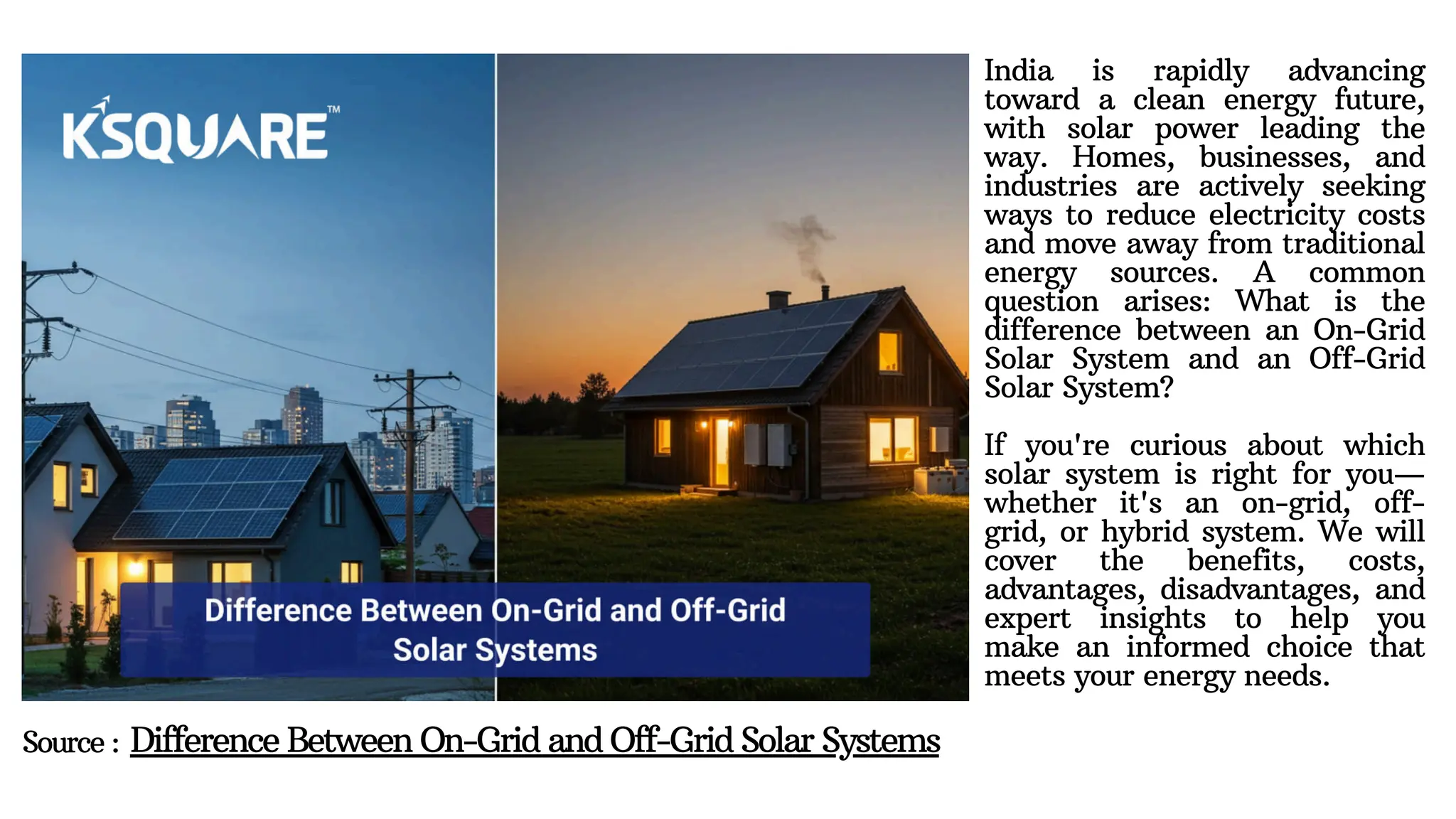 As India transitions to solar energy, Ksquare Energy helps you compare on-grid and off-grid solar systems understand how each works, their benefits, costs, and which solution fits your home, business, or industrial needs best.