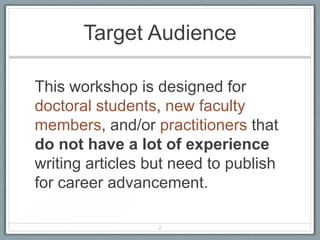 This document provides an overview of a workshop on breaking down the academic article writing process for new academics. The workshop objectives are to design a writing plan, select an article topic, write an abstract, understand the publication process, and provide feedback. It discusses selecting a prior work to develop into an article, writing a plan and schedule, overcoming obstacles, collaborating, writing an abstract, choosing a journal, and the review process. Attendees participate in polls and activities focused on their writing challenges and process.
