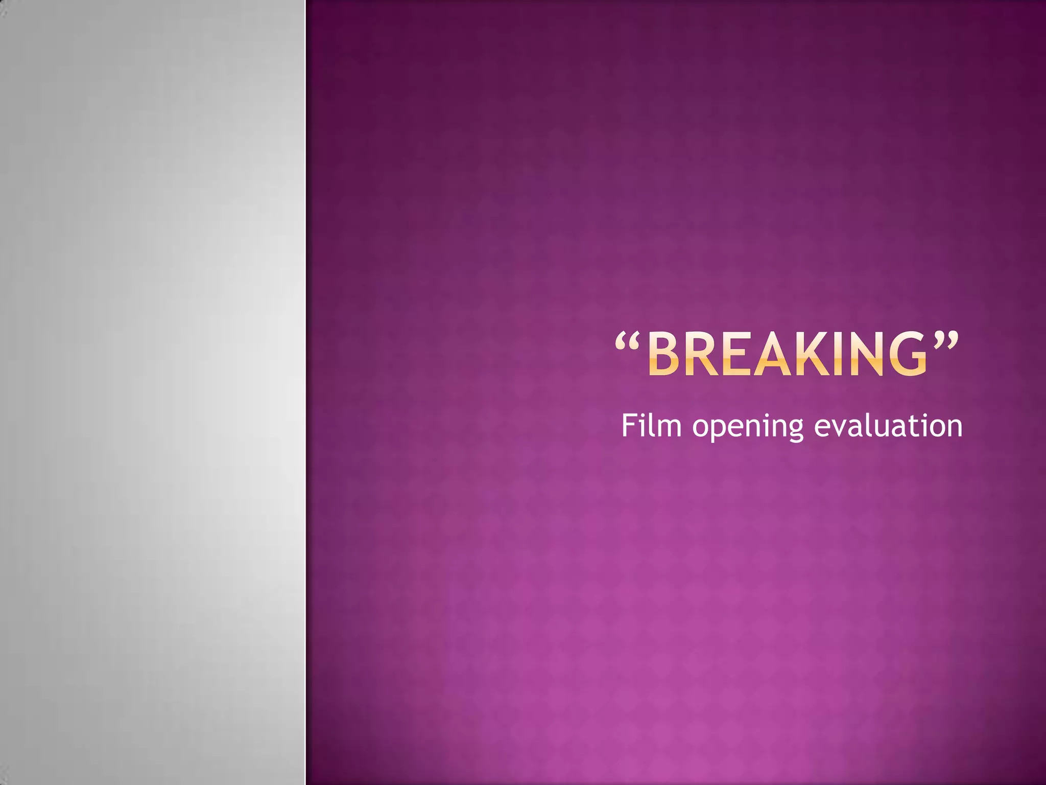 The document discusses conventions used in film openings, specifically teen romantic dramas. It analyzes the opening created by the author for their film "Breaking" which begins with the protagonist talking directly to the audience before the opening credits. Key conventions included are outdoor settings, costumes reflecting character types, camera techniques like low angle shots, and dark lighting to set the mood. The film is aimed at teenagers and explores themes of bullying. Overall, the opening challenges some conventions but adheres to others to effectively set up the film's genre and story.