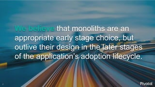The document discusses the migration of legacy applications to the cloud using Pivotal Cloud Foundry (PCF), emphasizing the benefits of breaking monolithic architectures into cloud-native microservices that adhere to modern development principles. It outlines the challenges associated with legacy systems, identifies criteria for choosing applications suitable for replatforming, and presents a structured approach for modernization, including best practices such as the 12-factor app methodology. Additionally, the document highlights tools and strategies for effective transformation, operational efficiency, and the importance of organizational alignment in achieving cloud-native objectives.
