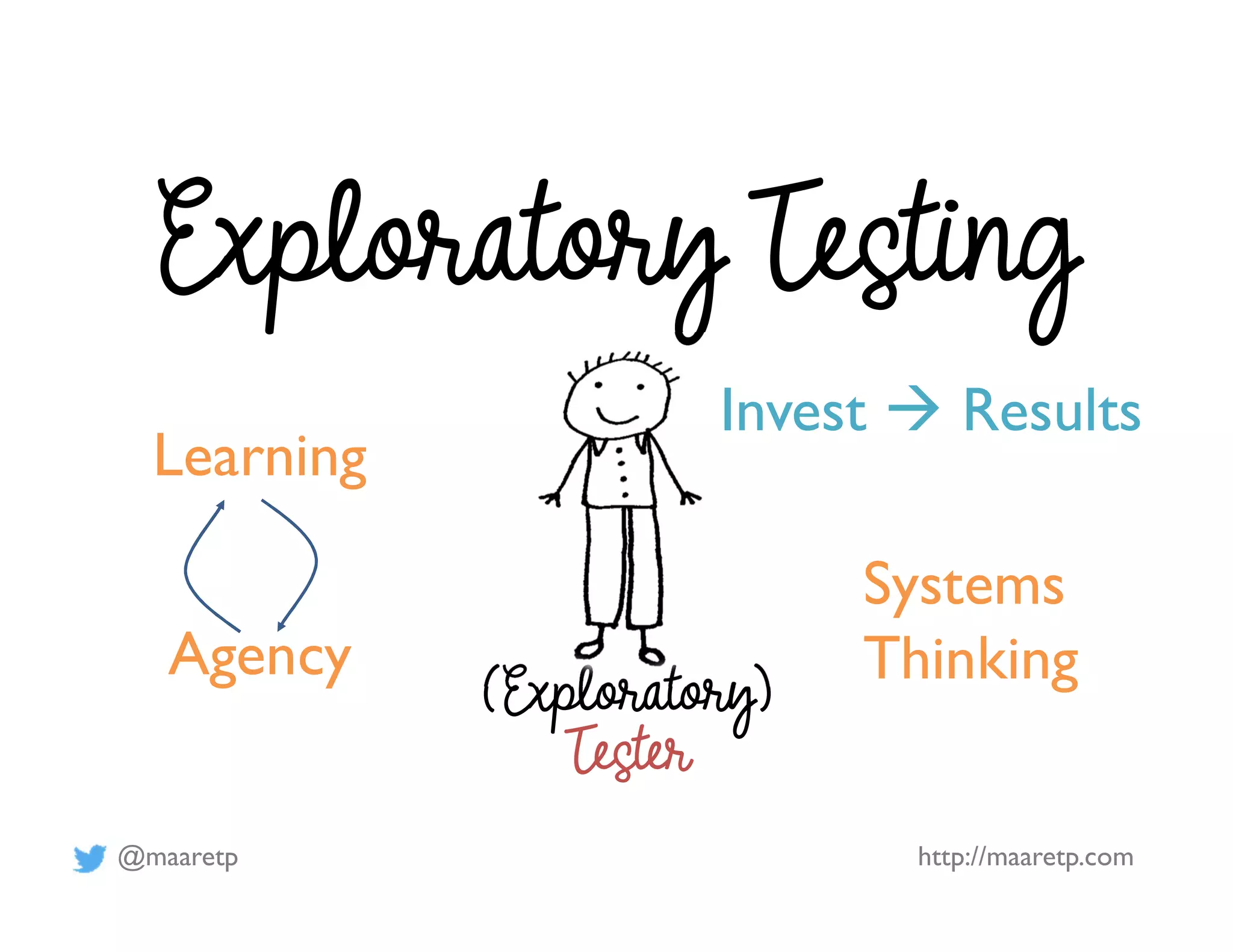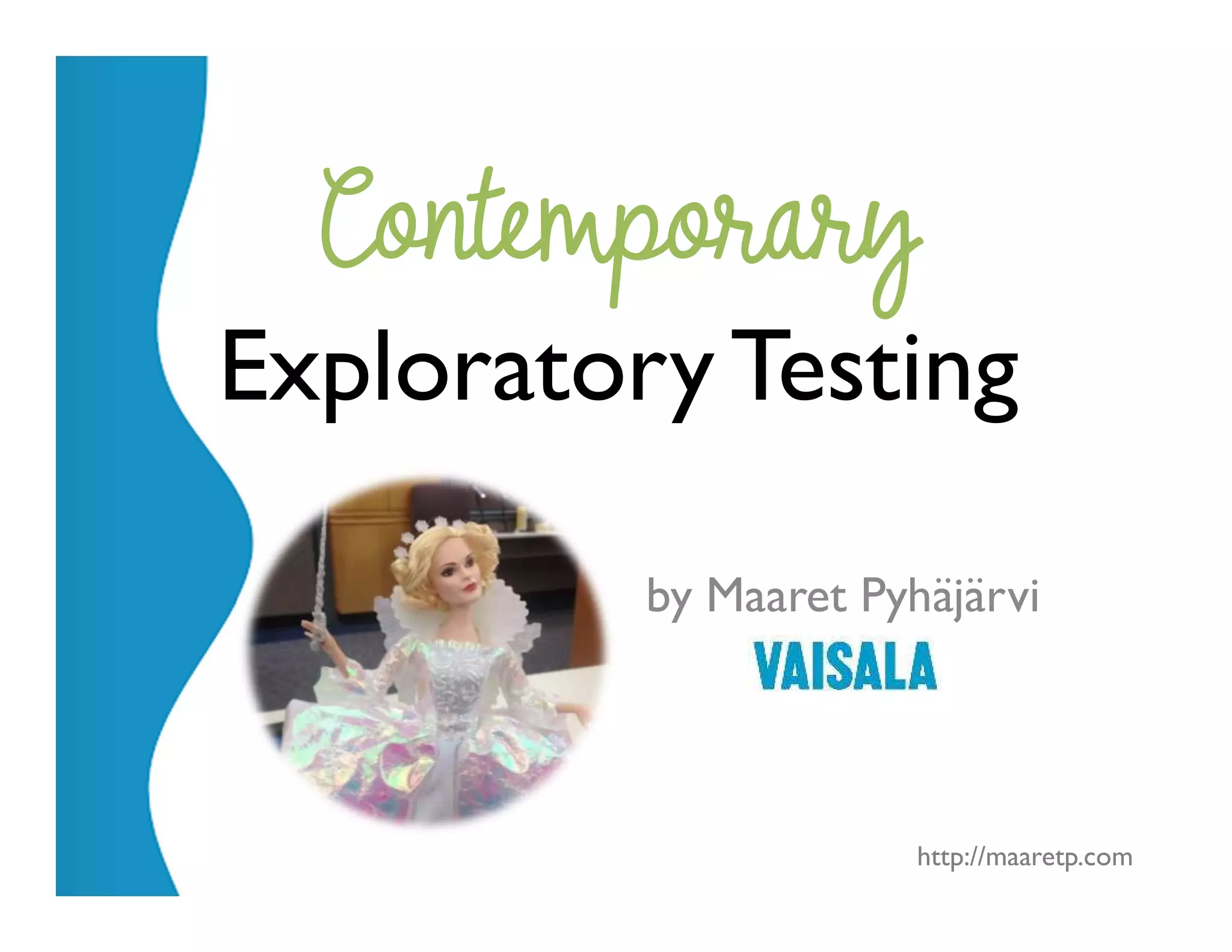 This document discusses exploratory testing and test automation. It provides tips for exploratory testers such as focusing the first test execution on gathering information and the repeating executions on automation. It also notes that testing is important for more than just testers and those who automate tests still need to explore systems. The document is authored by Maaret Pyhäjärvi and provides her contact information.